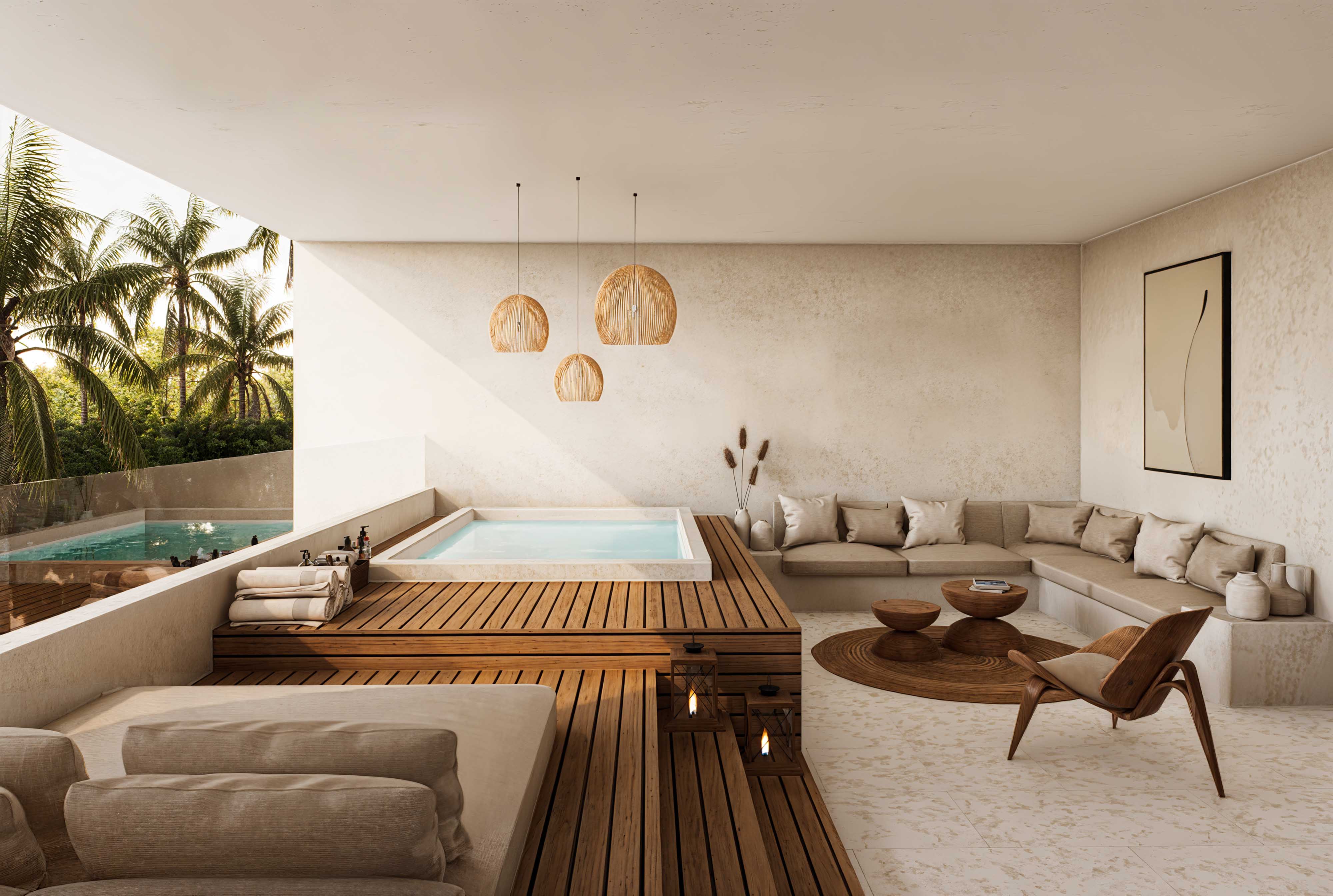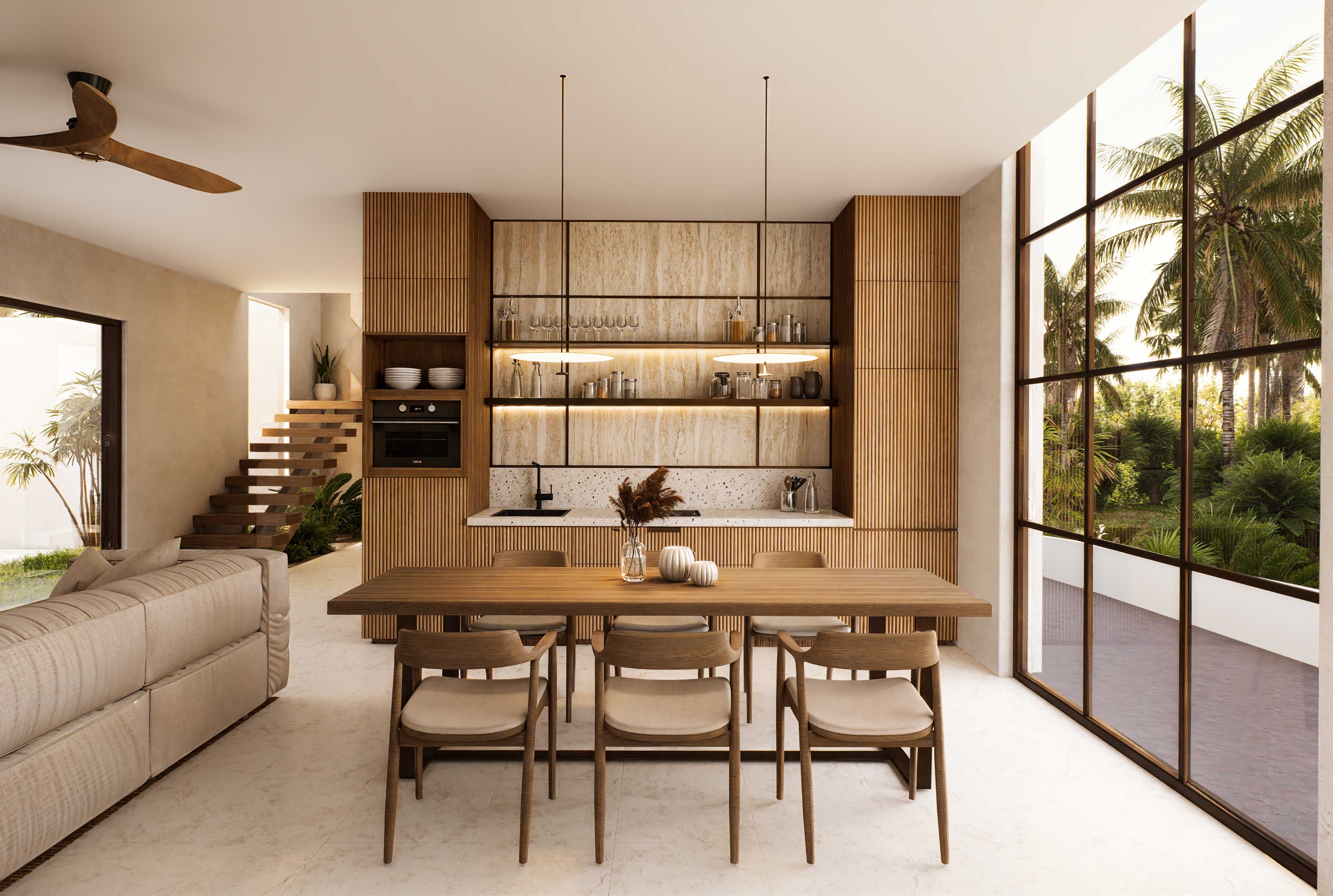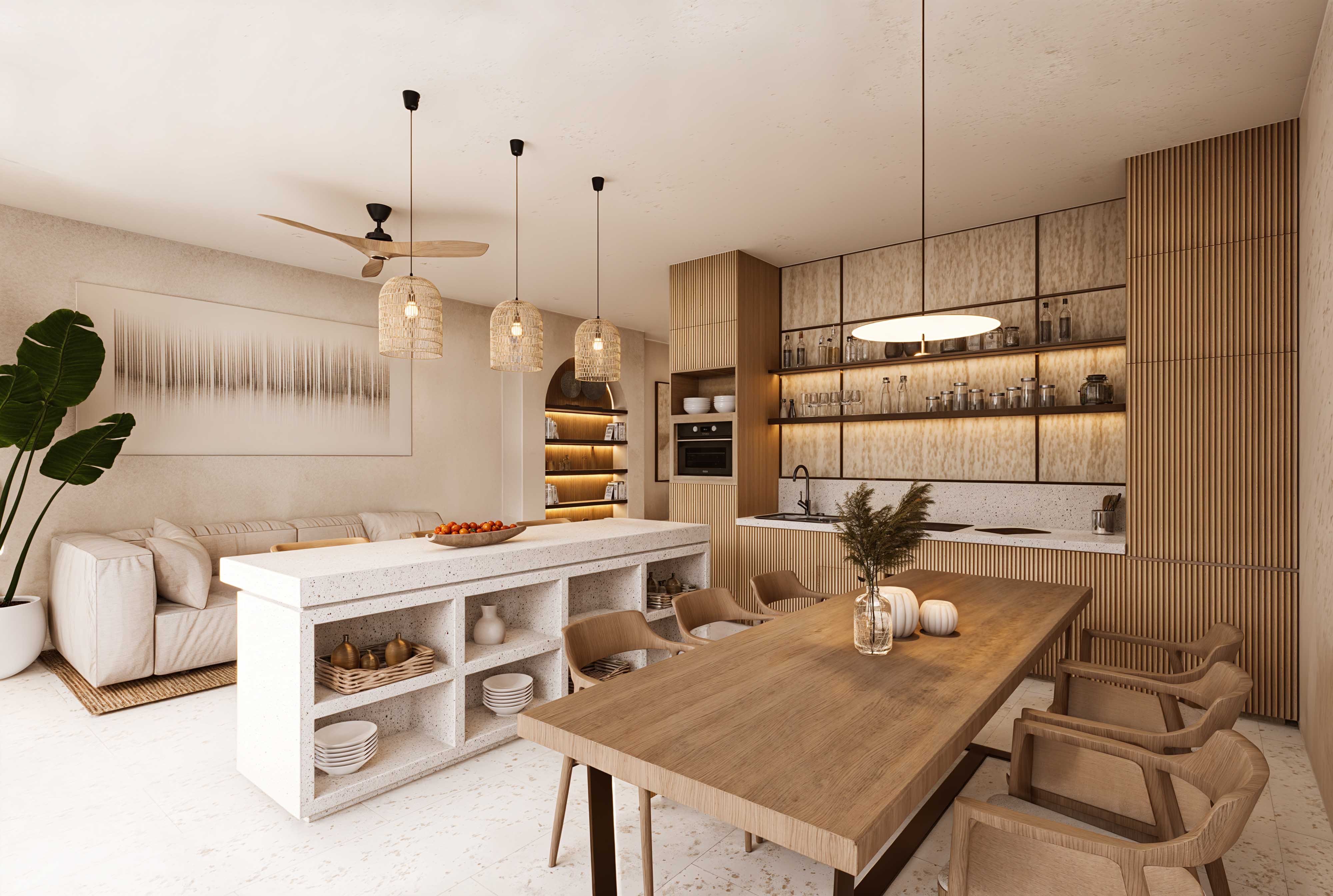 From the warm elegance of timber slats and wood to the timeless beauty of Palimanan stone, terrazzo, and travertine crema tiles, every element is chosen to enhance both functionality and style. Inside, rattan and bronze accents add a sophisticated touch, infusing the interiors with a perfect balance of rustic charm and modern luxury.