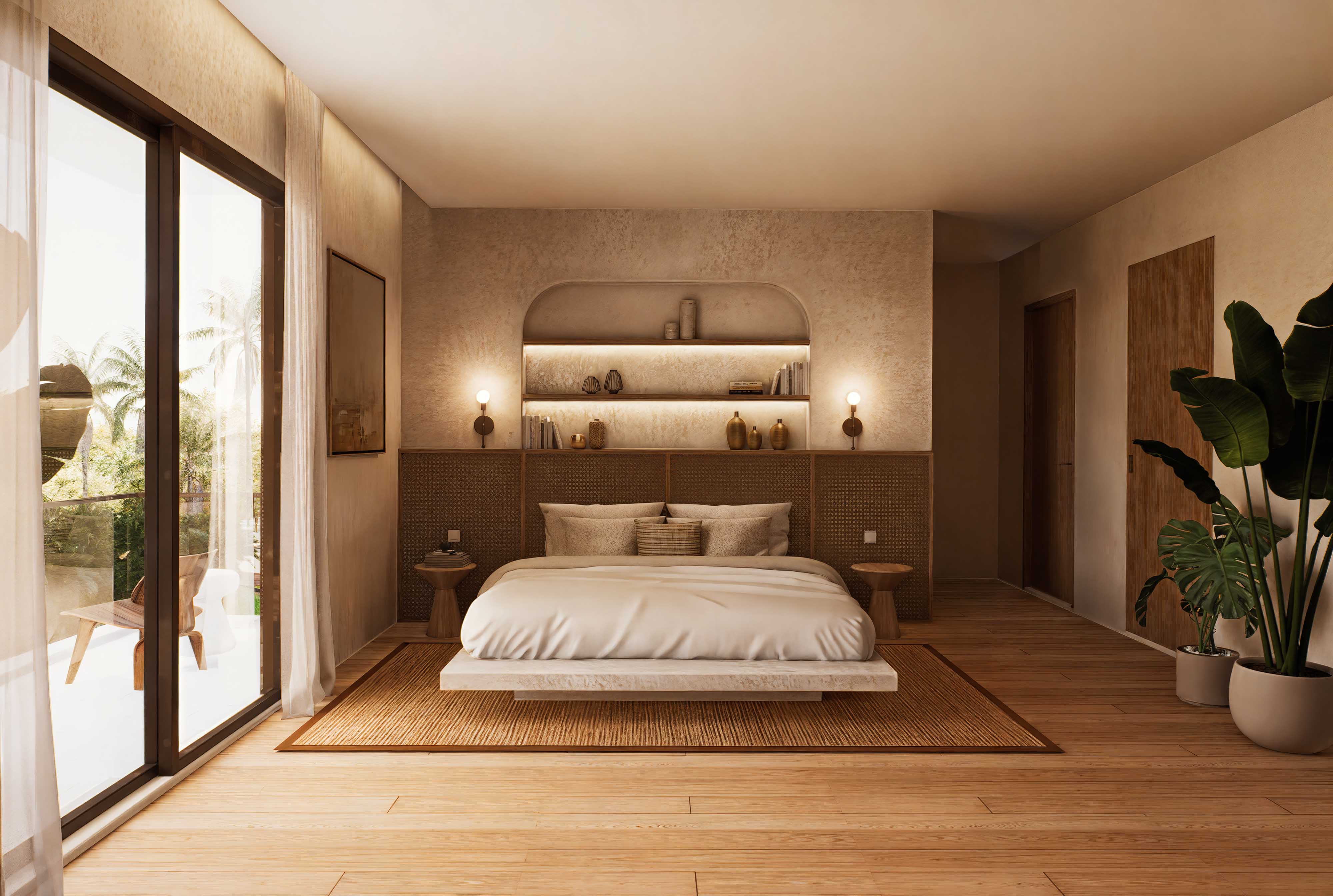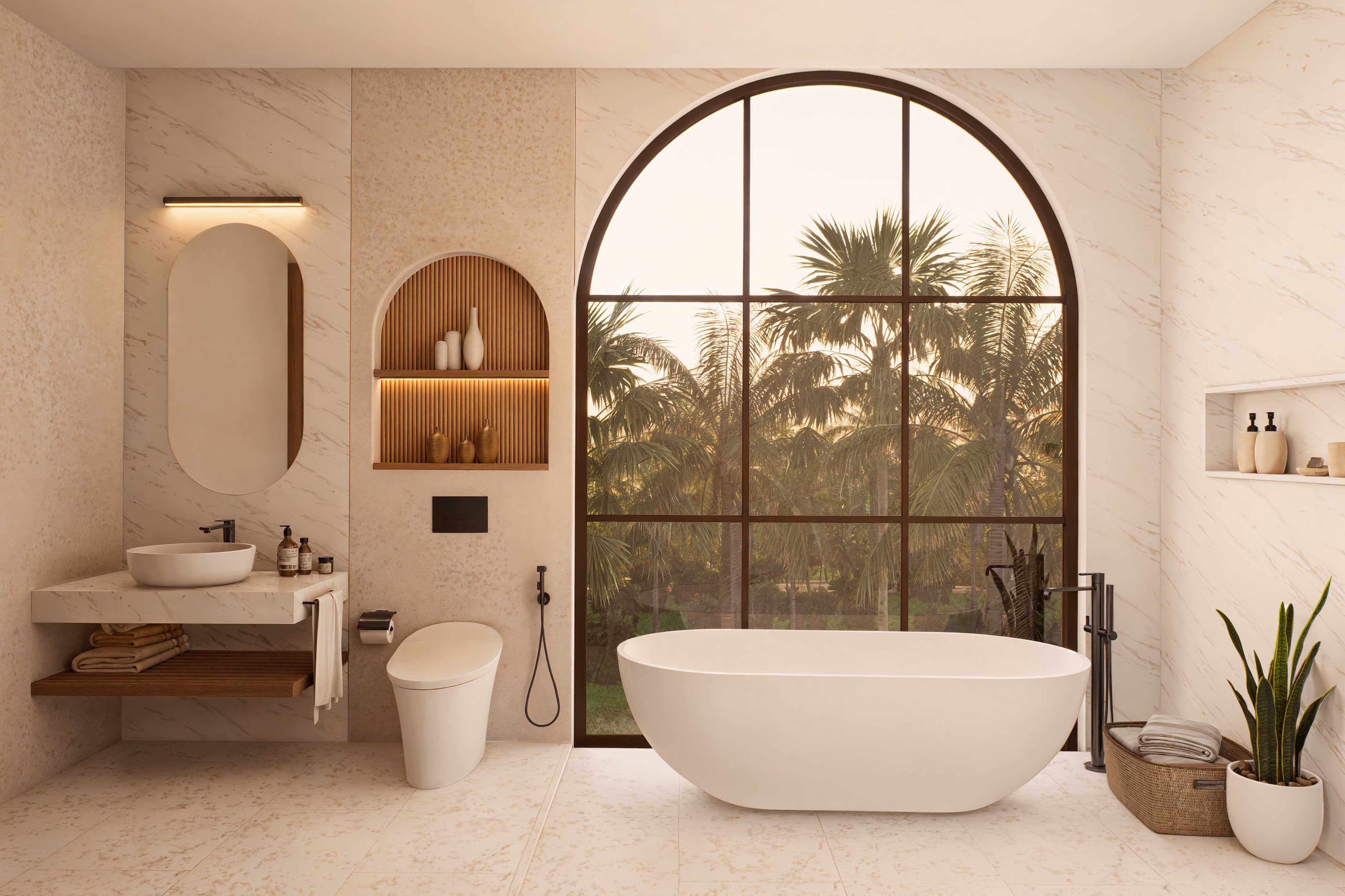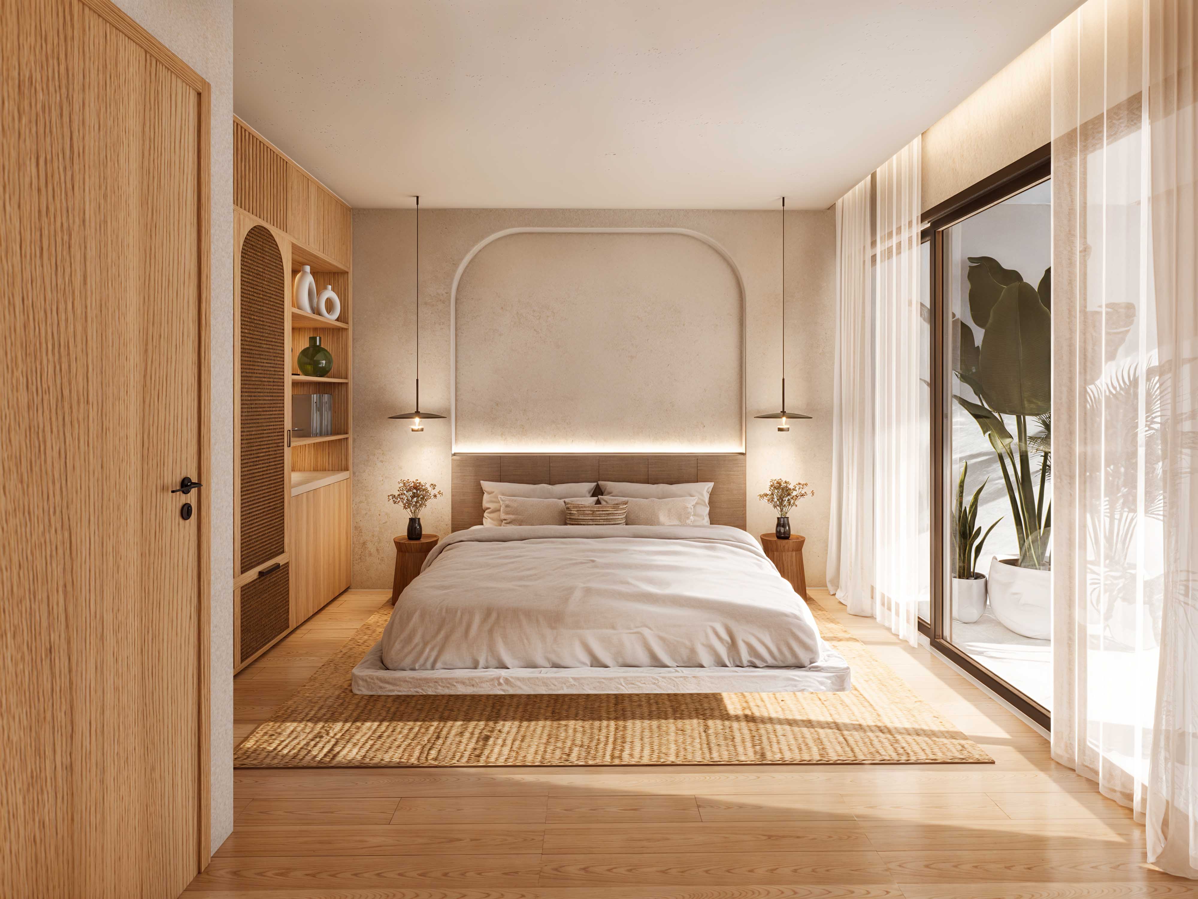 From the warm elegance of timber slats and wood to the timeless beauty of Palimanan stone, terrazzo, and travertine crema tiles, every element is chosen to enhance both functionality and style. Inside, rattan and bronze accents add a sophisticated touch, infusing the interiors with a perfect balance of rustic charm and modern luxury.